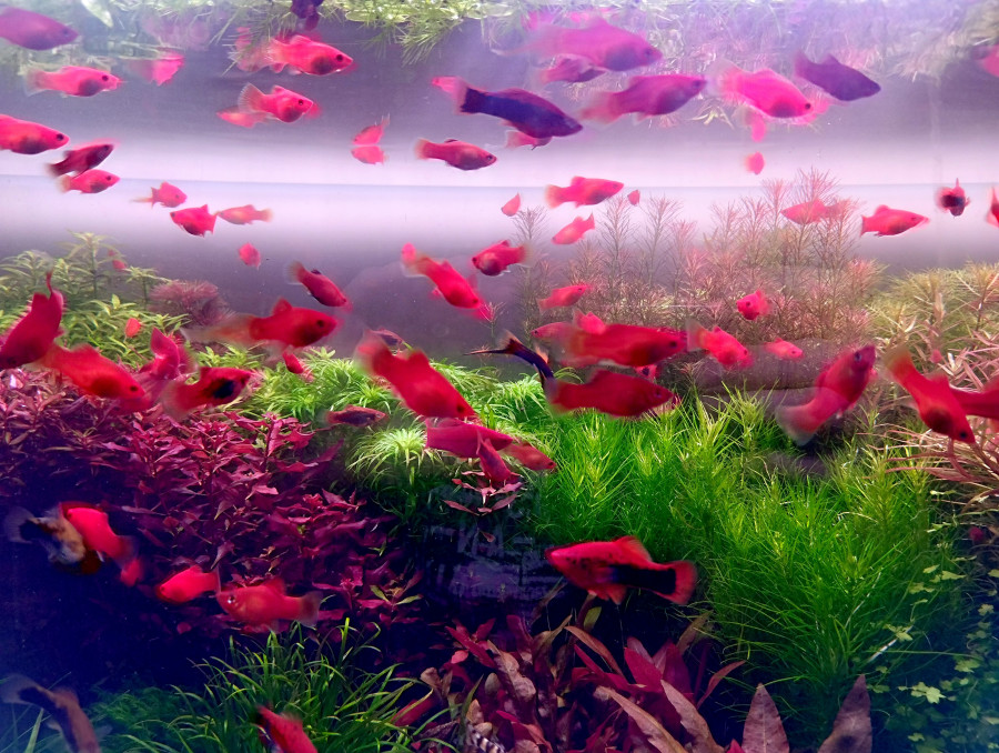 Пецилии собственного разведения. Рыба здорова, неприхотлива, адаптирована к сухим кормам. Размер взрослых особей составляет 3–5 см. Подходят для начинающих аквариумистов и небольших аквариумов.