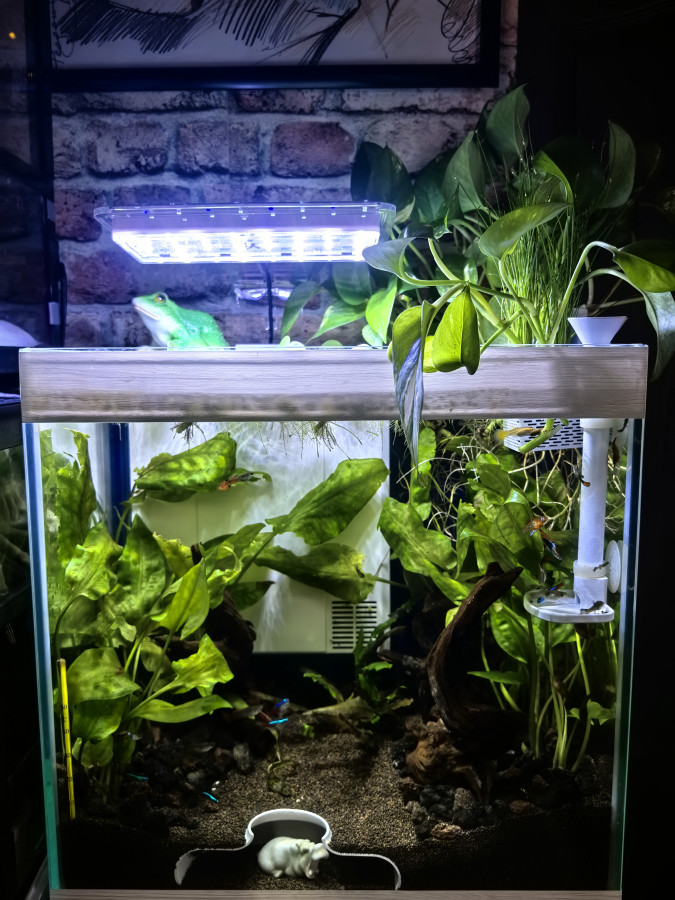 Аквариум 31, 5 литр. Размеры 35/35/26. Встроенная фильтрация(фильтр barbus био-комплекс со светильником), сенсорная подсветка с тремя режимами. В комплекте живые растения(криптокарины, геоцинты, пистия), натуральные мангровые коряги, грунт пропан, рыбки, креветки, фитотфильтр, кормушка для рыбок. В подарок набор для ухода за аквариумом.