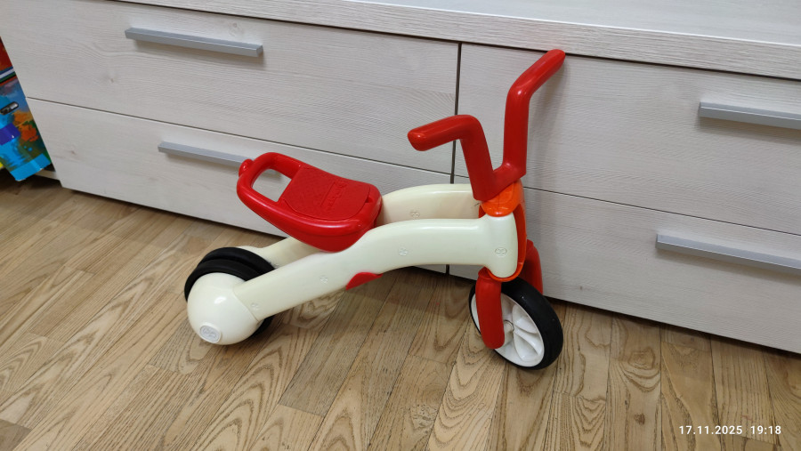 Этот беговел разработан в Бельгии. Он отлично подходит детям уже с 12 месяцев. Два положения высоты сидения. Колеса трансформируются «внутрь» или «наружу». Сами колеса с резиновыми накладками, хорошо подходят как для улицы, так и для дома (дочь каталась только дома). Небольшой вес. Имеется бардачок в сидении. Расстаёмся с нашим первым транспортом, отличным велосипедом-беговелом для самых маленьких. Цена 70р.