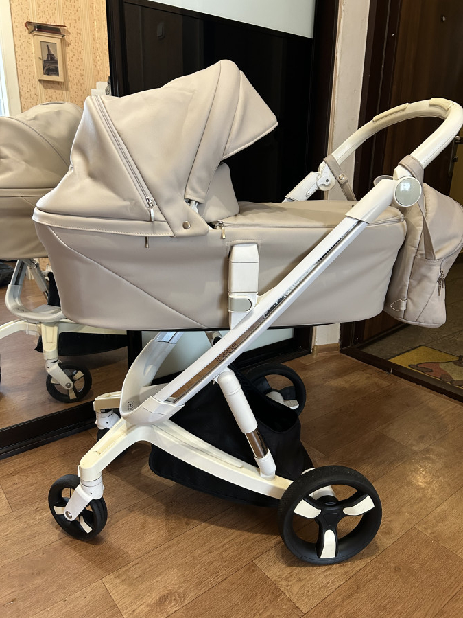 Стильная маневренная коляска в эко коже. В хорошем состоянии. Имеются незначительные потёртости. В комплекте имеется рюкзак, накидка на ножки, москитная сетка, дождевик. Тормозная система в коляске, что обеспечивает дополнительную безопасность.