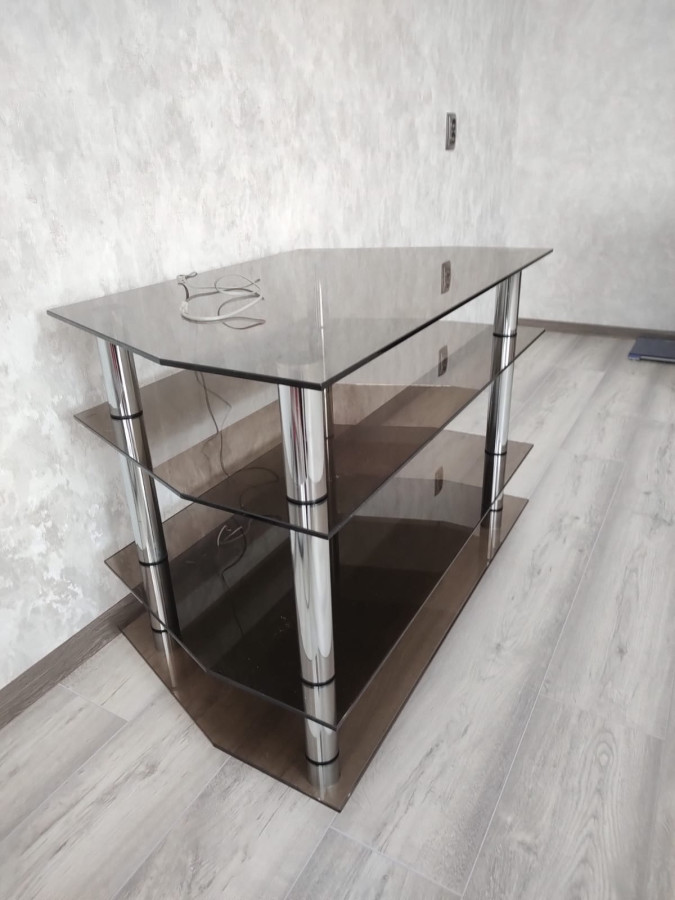Тумба под телевизор и аудио видео технику и пр. Стекло закалённое специальное, толщина 1см, тонированное, сделано под заказ .Тумба разборная, высоту проемов можно чередовать в любом порядке.Стойки из нержавейки(не китайской, не облезет). Состояние отличное!высота, ширина, глубина - 65×94×55см ; высота проемов- 16×27×14см. Самовывоз. 180 рублей