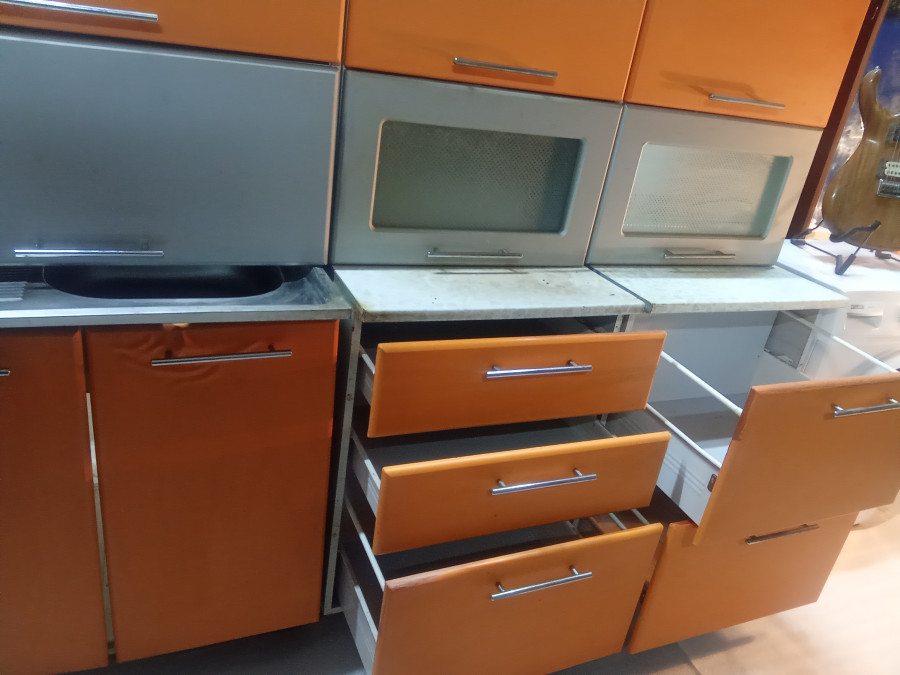 Кухню MDF 2.0 метра, цвет Оранж Металлик (выдвижные механизмы все на Металобоксах вместе с Мойкой Краном сушкой сифоном шлангами + Вытяжка Gefest) ручки хром релинговые, стекла витражные. как есть 425р только самовывоз 1й эт центр (кухня снята готова к перевозке)