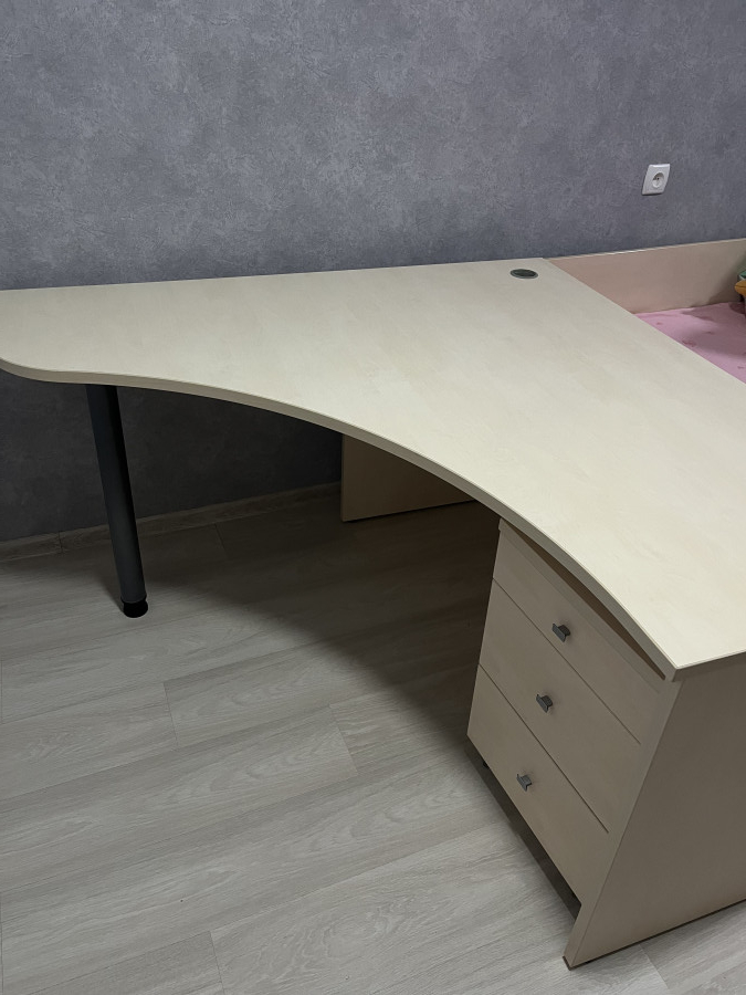 Стол немного б/у в идеальном состоянии, удобный, вместительный, выполнен из качественных материалов, тумба и подставка под компьютер не встроенные, можно разместить по своему желанию.Также к столу прилагаются две настенные полки.350р
