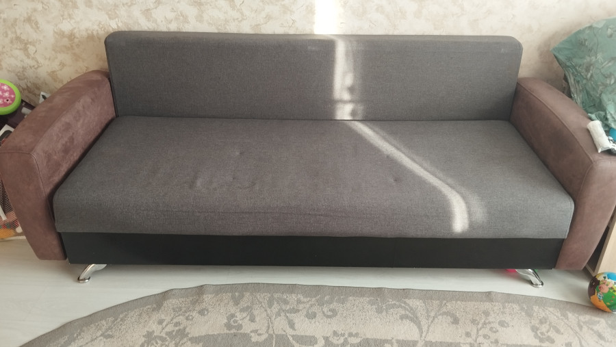 Диван трёхместный, раскладной, еврокнига, есть подушки. Немного чуть химчистка нужна.(Можно самому щёточкой).Не сильно.