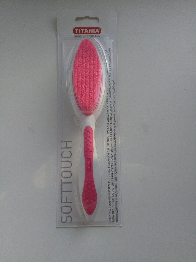 1)Двусторонняя эргономической формы терка Titania для педикюра (Германия) - очень удобная форма при использовании. Одна сторона тёрки с наждачной поверхностью, другая с пемзой для бережного и основательного удаления мозолей и ороговевшей кожи.