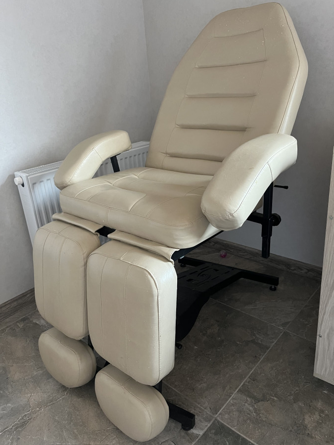 Покупала хорошее, для удобной работы себе и клиенту. Разлаживается спина и ножки. Поднимаются подлокотники. Поднимается и опускается кресло ножкой (очень удобно, я маленькая и делала это без усилий с клиентом на кресле) все видно на фото