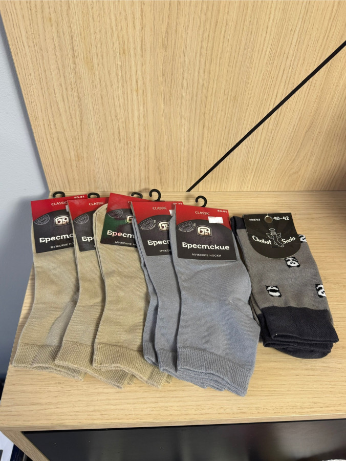 Новые мужские носки, размер 40-41. Все нормальные, но белые долго лежали в шкафу, на двух парах присутствует небольшой желтоватый оттенок. Я думаю, что они отлично отстираются с отбеливателем. Цена:15 руб. За все.