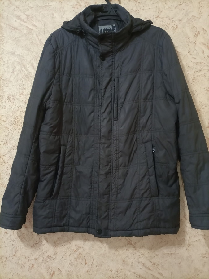 Осенняя куртка на тонком утеплении, цвет тёмно-серый, с лёгким капюшоном, который складывается в карман в воротнике, получается воротник-стойка. В хорошем состоянии, без дефектов, б/у, без пятен, фото не передало. ПОГ 62см, длина 79см, длина рукава с манжетом 68см. 30 руб.