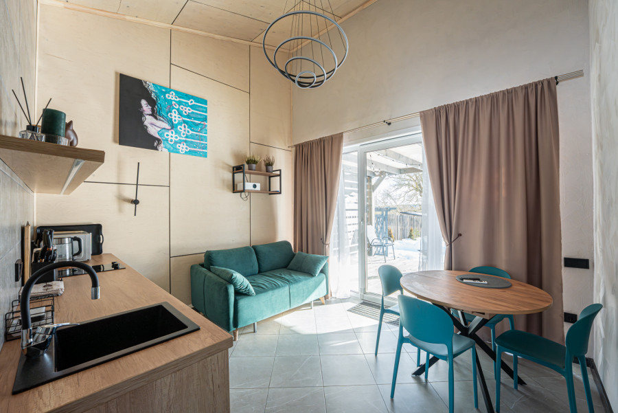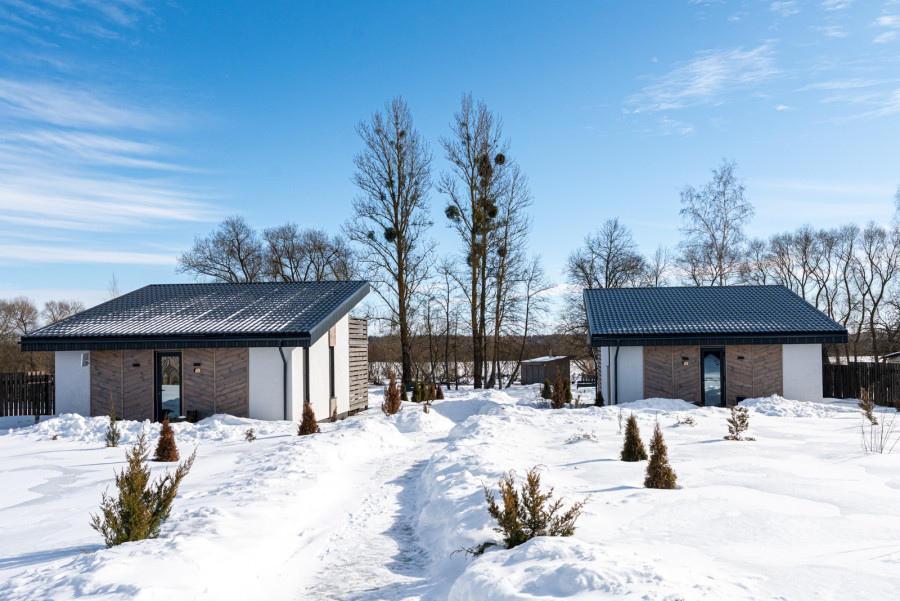Два уютных современных дома по 43 м² (до 6 человек в каждом): две спальни, просторная гостиная-кухня, санузел, большая терраса. В одном - дополнительный балкон.