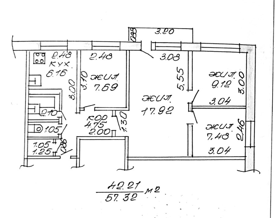 Общая площадь 58 кв.м., жилая 43 кв. м., кухня 6.2 кв. м.