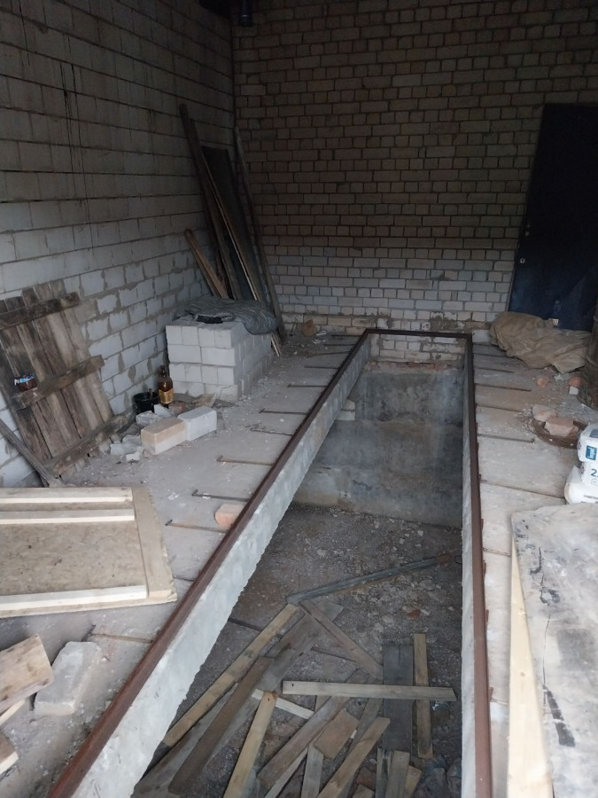 Подвал по всему периметру 4*6. Подведено электричество, разводки по гаражу нет. Рамка выставлена под заливку. Крыша накрыта. Подвал сухой. Без долгов, соседям не должен.