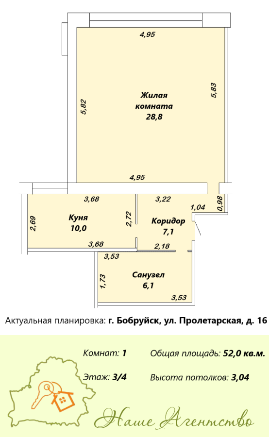 Площадь по СНБ 52 кв.м., комната 28, 8 кв.м. Кухня 10 кв.м., с/у 6, 1 кв.м.