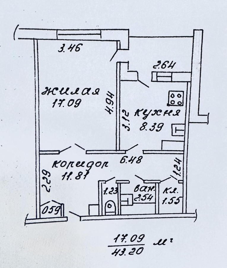 Общая площадь 43, 20 кв.м., жилая 17, 09 кв.м., кухня 8, 39 кв.м.