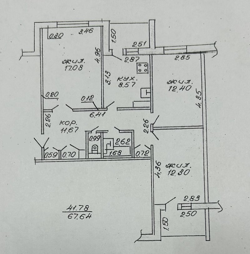 Общая площадь квартиры 67, 64 кв.м., жилая 41, 78 кв.м., кухня 8, 57 кв.м.
