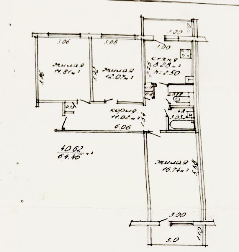 Три изолированные комнаты, раздельный санузел. Общая площадь 64, 5 кв.м., просторная кухня квадратной формы 8, 3 кв.м. Квартира в жилом состоянии.