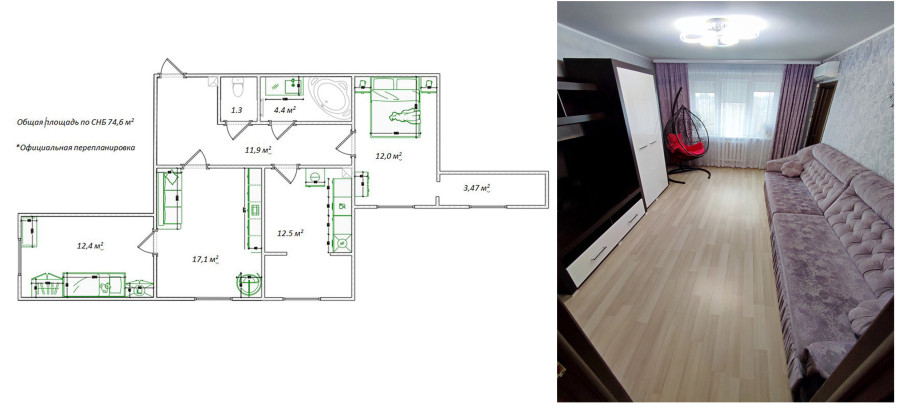 Трехкомнатная квартира площадью по СНБ - 74, 6 м², с инновационной планировкой - более функциональное расположение комнат, просторная кухня (12, 5 м²), огромная ванна комната (4.4 м²), балкон. Установлены два кондиционера и электробойлер, на случай отключения горячей воды. Мебель на фото и встроенная техника включены в стоимость квартиры.