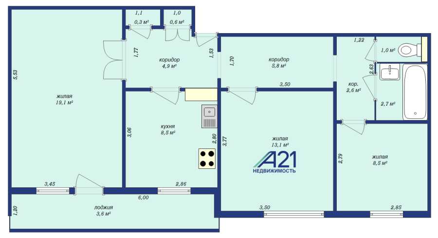 Площадь по СНБ 70.7 кв. м., три изолированные комнаты, просторная кухня - 8.5 кв. м., совмещенная с лоджией 3.6 кв. м.