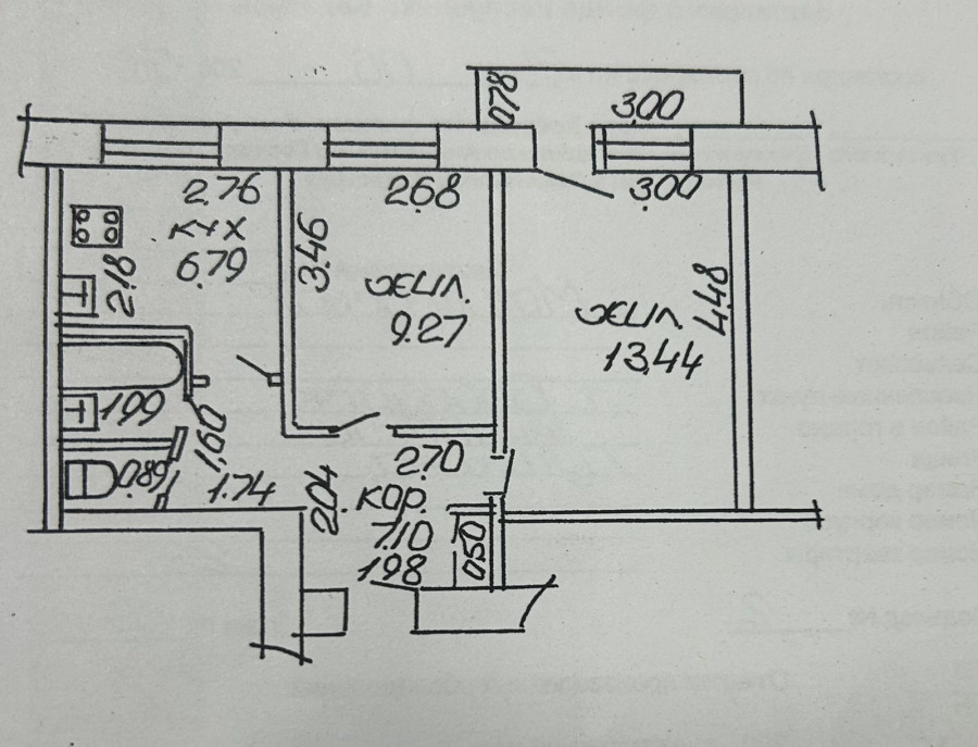 Общая площадь 40 кв.м., жилая 22, 7 кв.м., кухня 6, 8 кв.м.