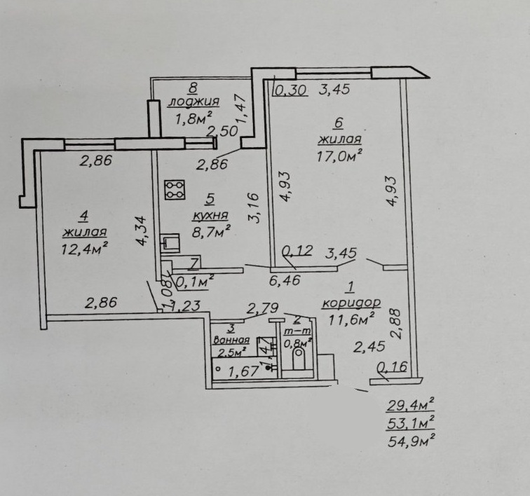 Общая площадь 53.1 кв м., жилая 29.4кв. м., кухня 8.7 кв. м., комнаты и санузел раздельные.
