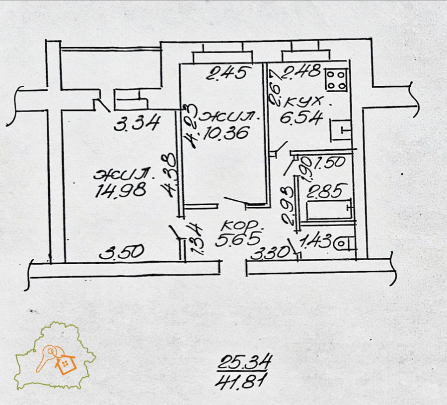 Площадь общая 41, 81 м2, жилая 25, 34 м2, кухня 6, 54 м2, высота помещения 2, 5 м. Квартира очень тёплая. Окна выходят во двор, комнаты изолированные, раздельный санузел, лоджия застеклена, в квартире установлены окна ПВХ .