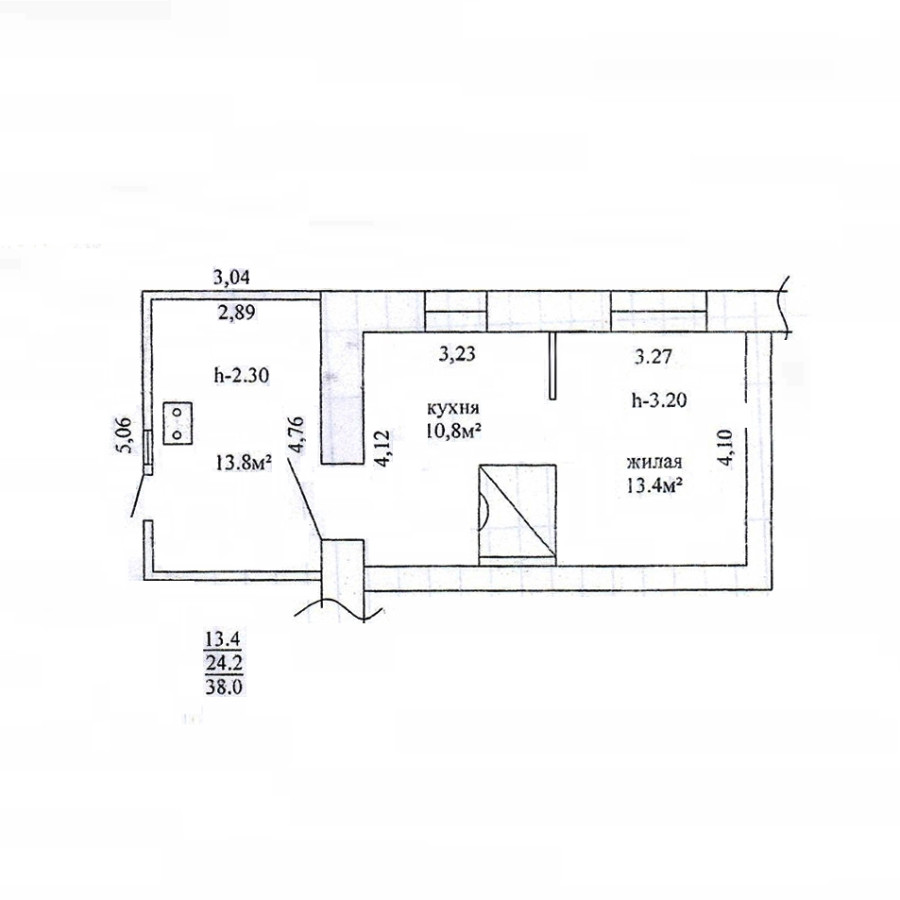 - Общая площаь 38 кв.м., комнат - 24 кв.м., кухня обустроена на веранде 13, 8 кв.м.