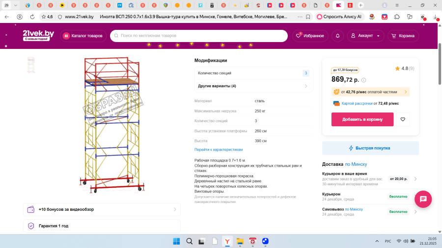 Продаю вышку - туру в отличном состоянии. Делали побелку, немного остались белила. Материал сталь, три секции, максимальная нагрузка 250 кг. вес 80 кг. Высота 390 . Легко обрабатывать потолки высотой 4 - 6 метров. Вышка-тура новая, время использования 1 месяц. Покупалась в прошлом году. Вышка-тура находится в разложенном состоянии, в полном комплекте. Повреждений нет. Можно собрать и разобрать. Писать на адрес: divanekonom@yandex.by
