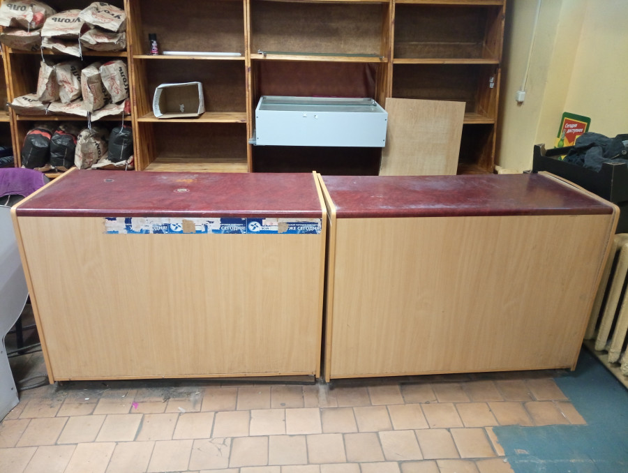 торговые прилавки и кассовые тумбы по 50 руб., горки (сосна медовая) высота 2, 35 метра 5-6 полок, ширина 0, 8 метра, глубина 0, 57 метра по 75 руб одна горка.