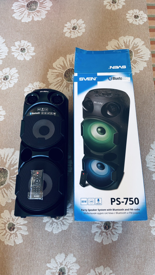 SVEN PS-750 — мощная портативная 80-ваттная акустика для вечеринок с Bluetooth, LED-подсветкой, FM-радио и караоке (два микрофонных входа с эхо). Колонка обеспечивает громкий, объемный звук (45 Гц - 22 кГц) с 14.5 см низкочастотными динамиками. Работает автономно (2х4400 мАч), поддерживает USB/microSD, управляется кнопками или пультом.