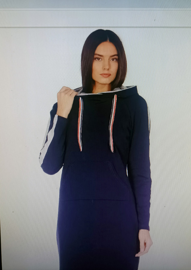 Новое платье 48-й размер, с капюшоном и карманом кенгуру. Футер, двунитка. Темно-синее, серые вставки. Пр-во Россия. Идет на рост 164, до колен. Рост модели на фото 174. Куплено дороже, на известном сайте продажи товаров. Почтой высылаю с вашей оплатой пересылки. Без обмена. Товар в г. Бобруйске. На себе не сфотографирую-сейчас тесновато, плохо сидит. 30 рублей.