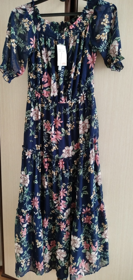 Очаровательное длинное платье с открытыми плечами, приталенный силуэт, непрозрачный подклад, длина макси, широкий вырез "кармен" на резинке, эластичная резинка на талии, рукав 3/4 фасона "фонарик" на резинке, ярусный подол.Новое.Цена 70 р.