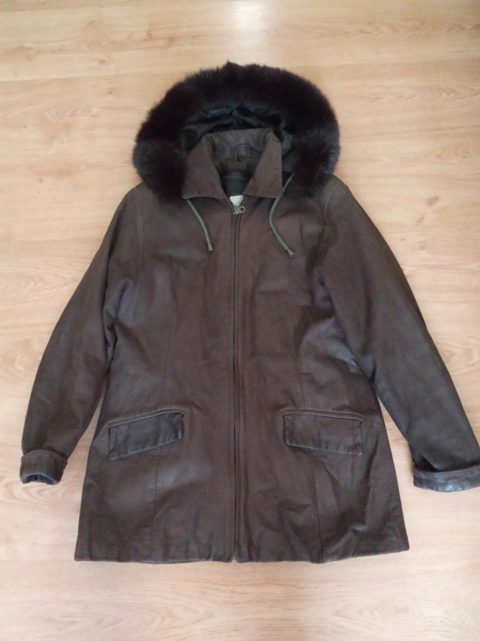 Кожаная куртка с плюшевой подстежкой с рукавами, съемный капюшон с опушкой из натурального меха, есть пояс. Цвет коричневый, кожа натуральная, не гладкая и не мягкая. ПОГ 48см, длина 75см, длина рукава 56см. Б/к в нормальном состоянии, без особых дефектов. Есть небольшая "засаленность" на карманах и манжетах. Некритично. 45 руб. Торг.