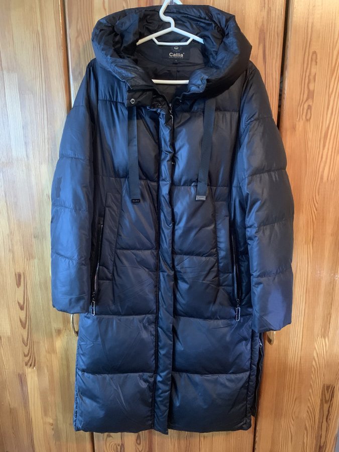Женский демисезонный длинный пуховик с капюшоном ( не отстегивается ), подойдет на 46-50 размер, свободный покрой, длина 110 см, грудь 108 см, от плеча до плеча 42 см, бедра 110-116 см, длина рукава 65см, 2 бегунка ( вверх и вниз ), 2 кармана с каждой стороны ( на кнопке и на замке ), боковая молния 43 см, состав полиэстер, лента для утяжки на капюшоне, наполнитель плотный . 8029 622-63-64 а-1 .