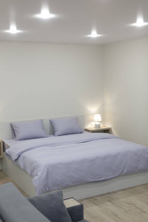 большая монолитная кровать с ортопедическим матрацем, постельное белье высокого качества;