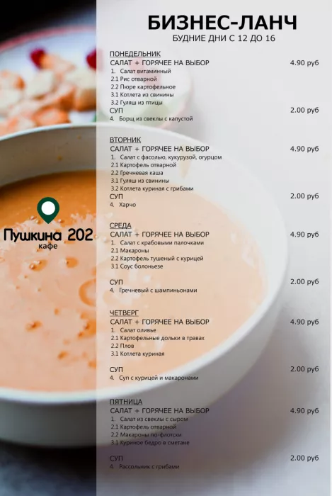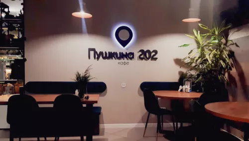 Кафе "Пушкина 202" - новое атмосферное место в центре Бобруйска с разнообразными блюдами, алкогольными и безалкогольными напитками на любой вкус. Команда "Пушкина 202" внимательно следит за мировыми тенденциями сферы гостеприимства, поэтому каждый найдет здесь что-то себе по душе! Каждый день с 10:00 до 23:00 двери кафе "Пушкина 202" открыты для гостей.