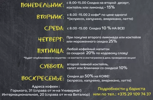 Ассортимент: кофе, чай, кофейные напитки, горячий шоколад, кондитерские изделия и др. Фоновая музыка и предсказание на дне каждого стаканчика