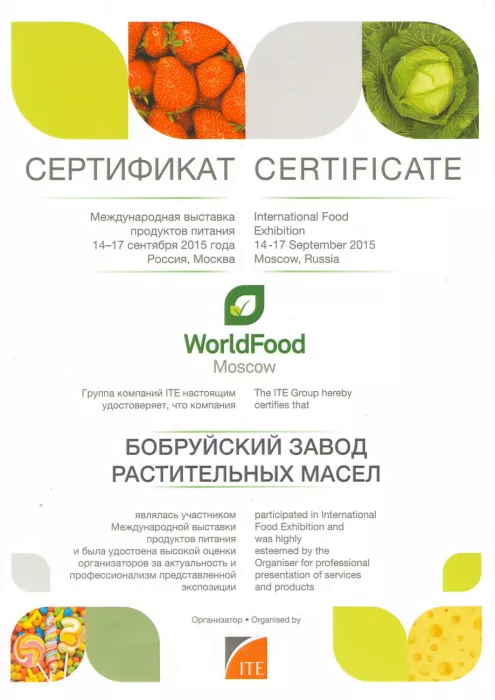 Продукция ОАО «Бобруйский завод растительных масел» является высококачественной, экологически чистой, не содержит ГМО, производится на современном высокотехнологичном оборудовании и соответствует требованиям международных и европейских норм, что подтверждено сертификатом системы менеджмента качества с учетом требований СТБ ISO 9001-2009.