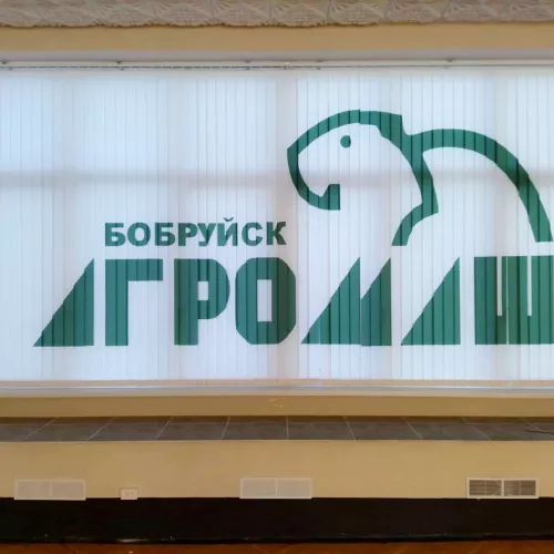 Сделали жалюзи с фотопечатью логотипа в актовый зал «Бобруйскагромаш»