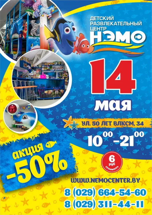 Ура! Завтра, 14 мая в Детском развлекательном центре "НЭМО" супер акция -50%