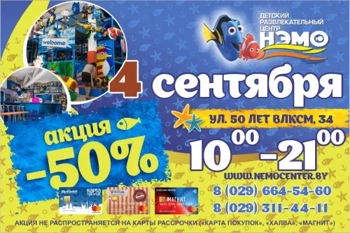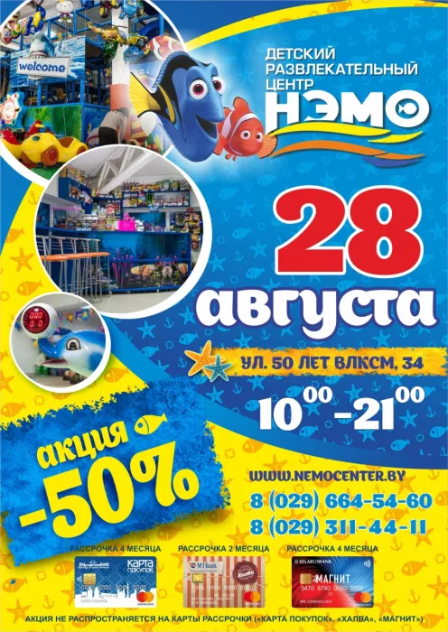 Внимание! 28 августа в Детском развлекательном центре "НЭМО" супер акция -50%
