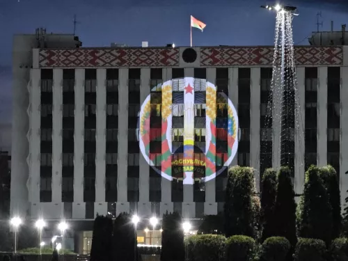 На фасад Бобруйского горисполкома в темное время суток проецируется герб Беларуси. Фотофакт