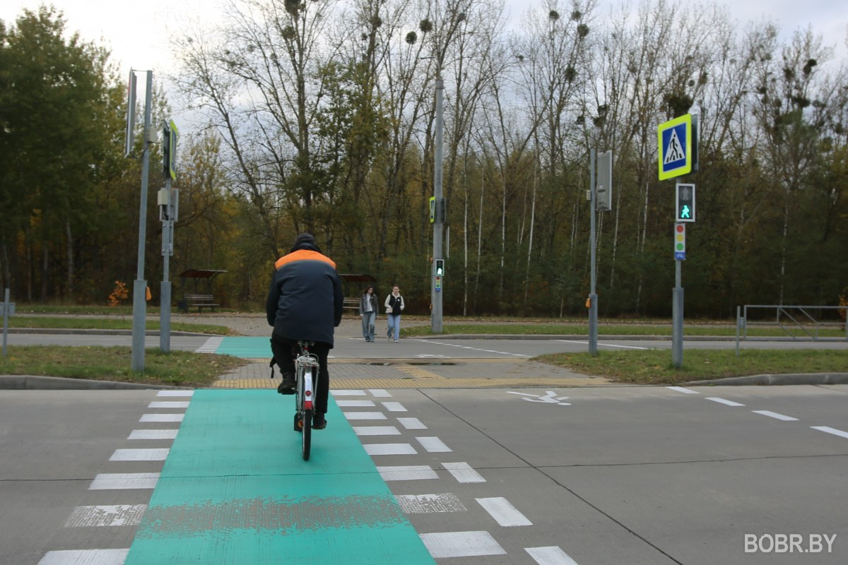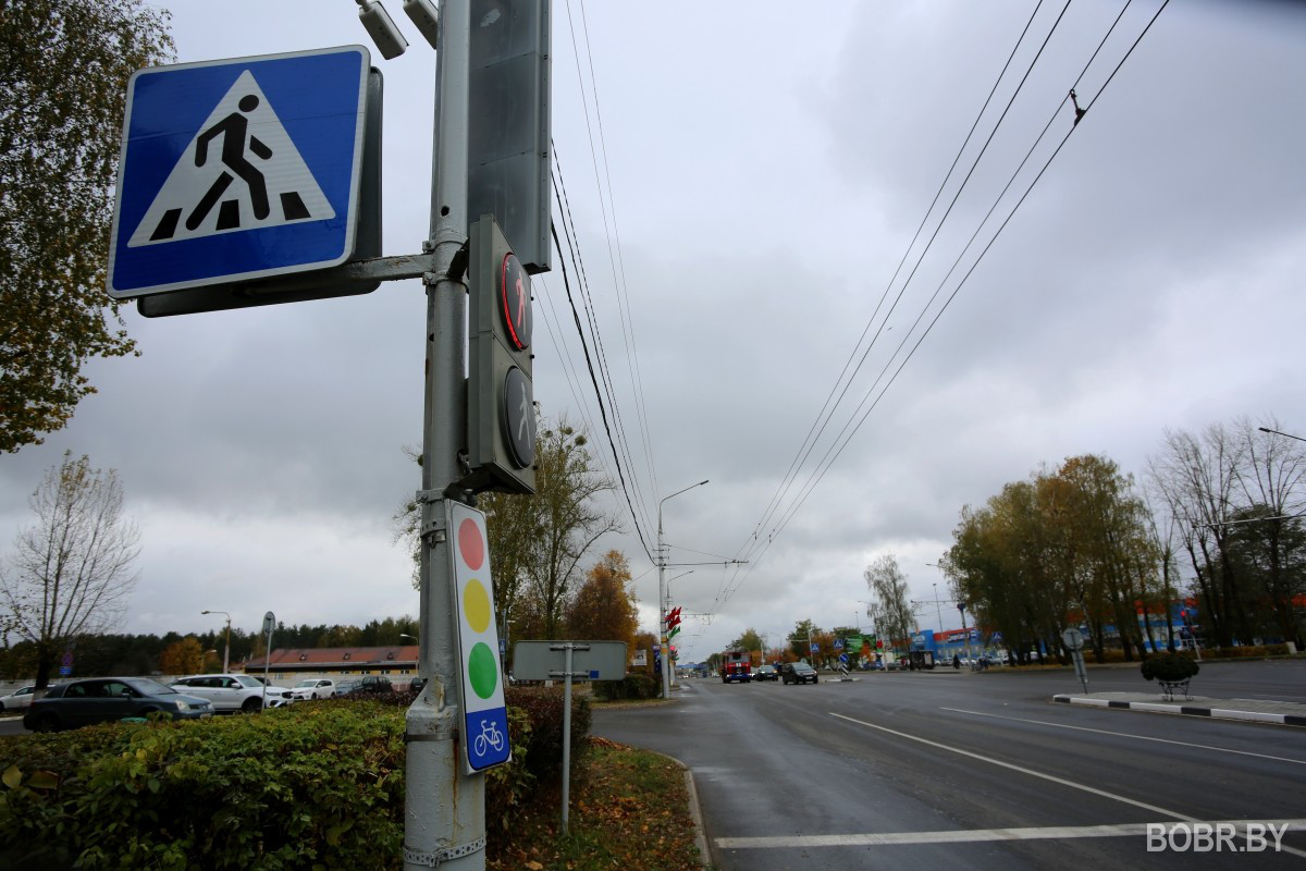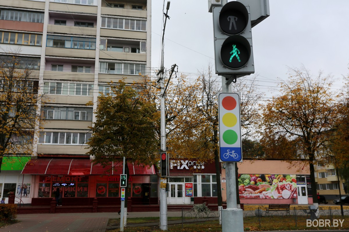 При пересечении на зеленый на некоторых из пешеходных переходов в Бобруйске велосипедист имеет право не спешиваться. Светофоры на таких переходах промаркированы специальным знаком.