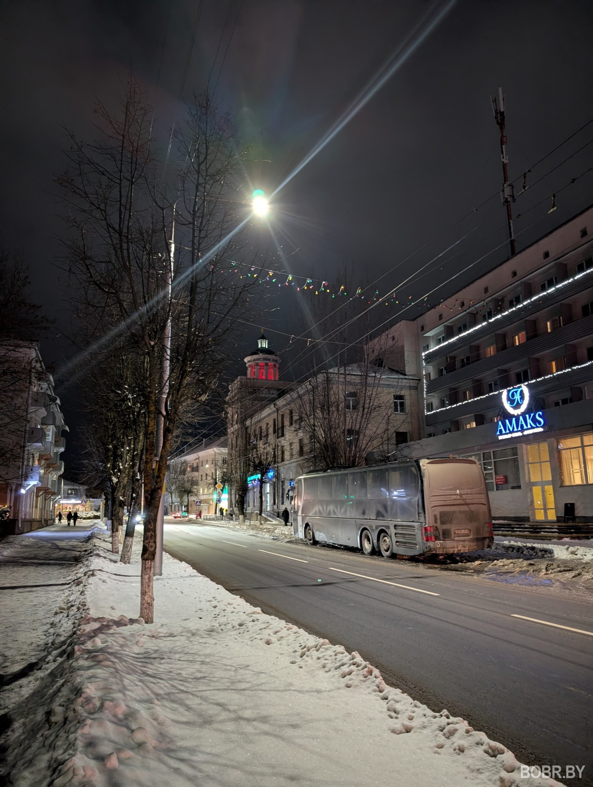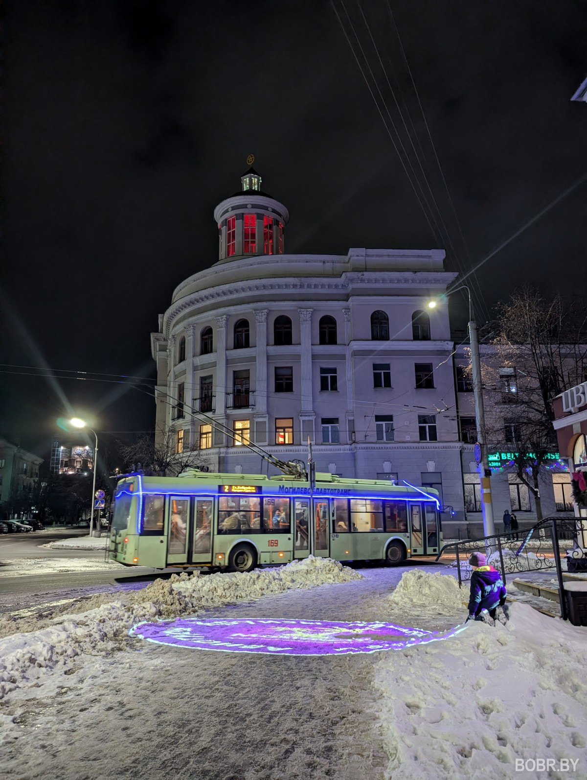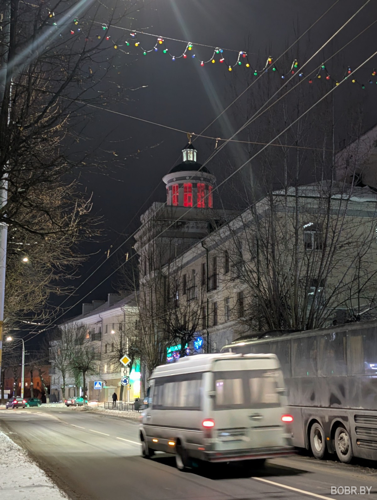 Башенка гостиницы «Бобруйск» подсвечена изнутри и добавляет праздничной атмосферы зимнему городу.