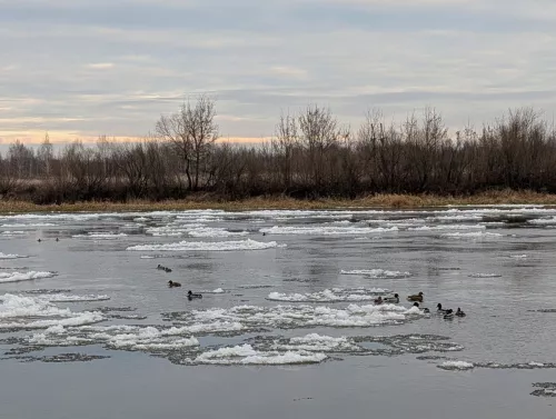 По Березине идет шуга. А утки лавируют между рыхлых льдин ВИДЕО