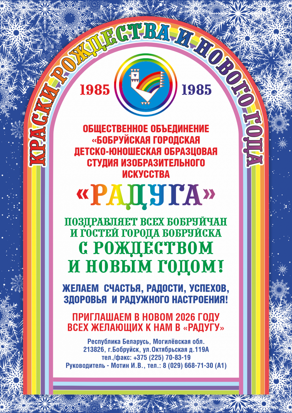 Обильный снегопад и мороз не стали помехой для юных художников и их родителей собраться в студии «РАДУГА», чтобы получить заслуженные награды за свой творческий труд. В своих работах они поделились праздничной радостью, настроением и фантазией на выставке в холле Бобруйского театра и на странице Бобруйского портала BOBR.BY. Работы юных художников смогли увидеть и оценить тысячи зрителей театра и более восьми тысяч посетителей сайта.