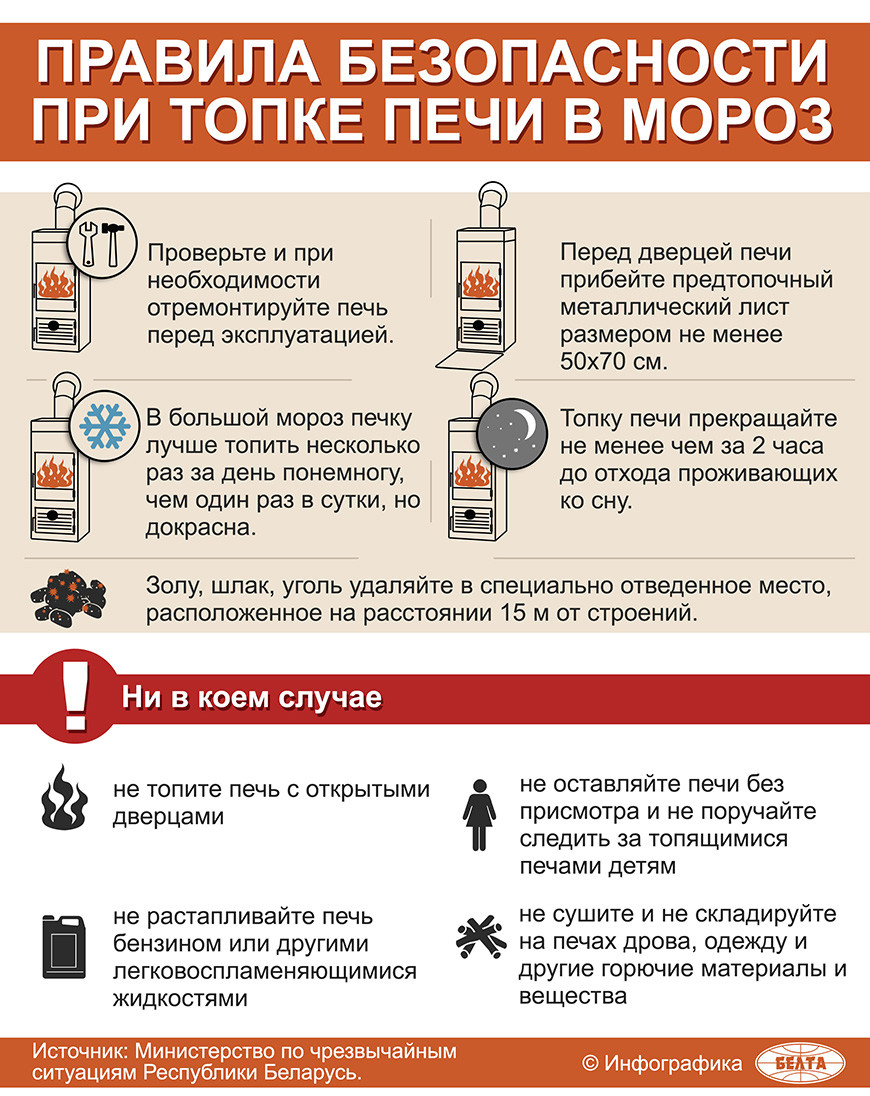 -Не оставляйте без присмотра топящиеся печи и не поручайте надзор за ними детям. Минимум за 2 часа до сна прекращайте топку печи.