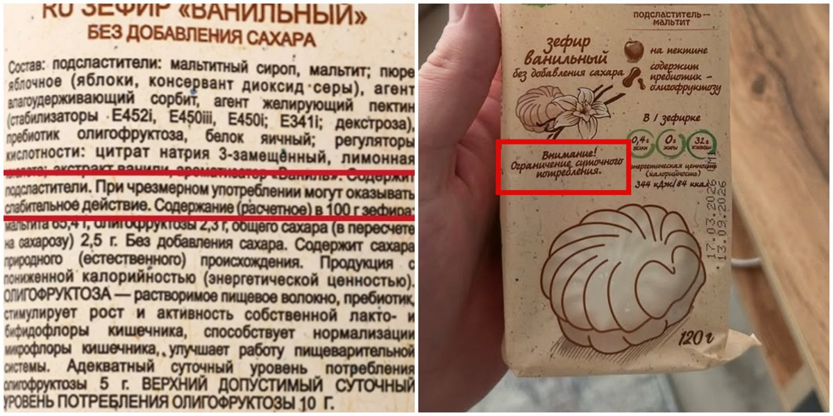 — В одной порции такого зефира содержится 26 граммов мальтита, при этом для слабительного эффекта хватает 20—30 граммов за раз. То есть даже одна штучка может вызвать последствия (хотя это очень индивидуальная история). А учитывая, что люди часто покупают такой зефир как более здоровую замену сладкому (и здесь они, в общем-то, правы), то и употреблять его они планируют «от души».
