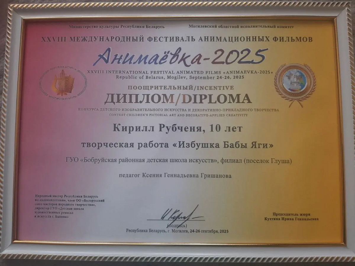 Воспитанник ГУО «Бобруйская районная детская школа искусств» Кирилл Рубченя (педагог Гришанова Ксения Геннадьевна) за работу «Избушка Бабы Яги» награжден поощрительным дипломом.