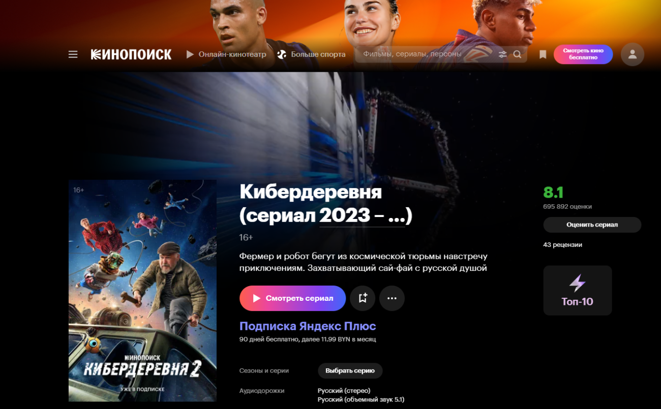Все фильмы, сериалы и книги доступны по подписке Яндекс Плюс — с доступом к Яндекс Музыке, Кинопоиску, Яндекс Книгам и кешбэком баллами в сервисах Яндекса.