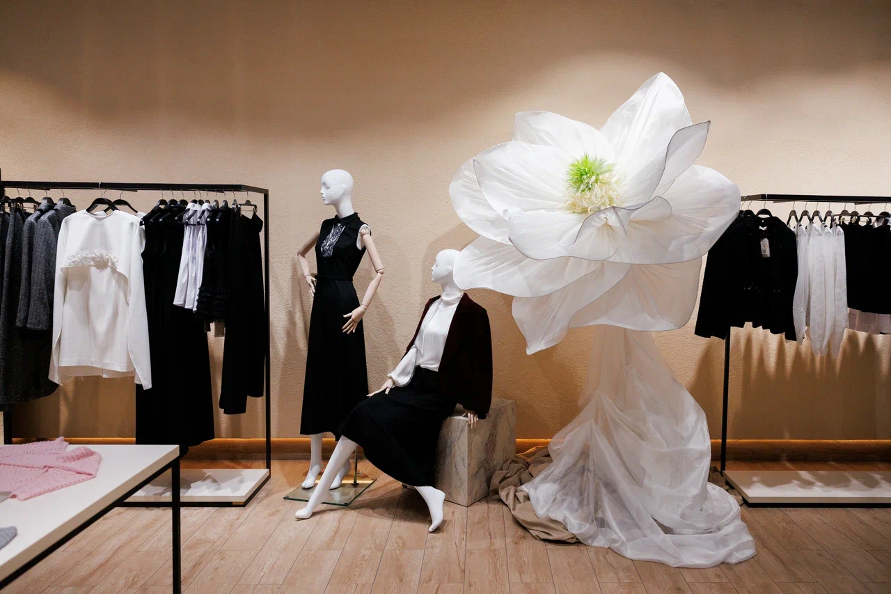 Для нового бренда это первый магазин в стране. Пространство расположено на третьем этаже и оформлено в светлых тонах. Центральный акцент в интерьере — арт-объект в виде большого цветка из органзы.