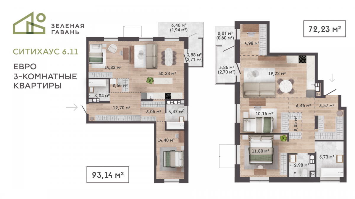 В ситихаусе будет 3 подъезда на 69 квартир. Выбор площадей широкий – от «евродвушек» на 39 «квадратов» до 126-метровых пятикомнатных вариантов. В них будут мастер-спальни, гардеробные и ванные с окном. Квартиры на 93 и 72 «квадрата» получат балконы с комбинацией открытой и остекленной части.